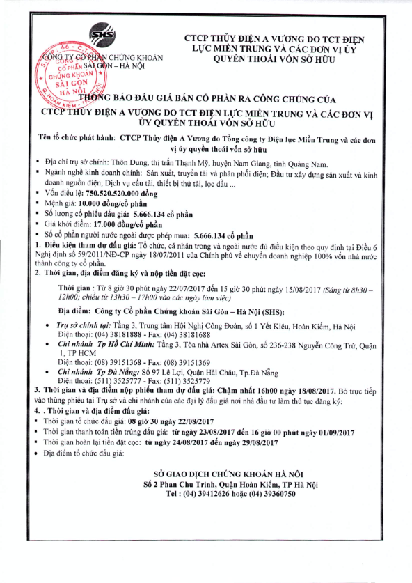 Thông báo đấu giá CTCP Thủy điện A Vương do Tổng công ty Điện lực Miền Trung và các đơn vị ủy quyền thoái vốn sở hữu