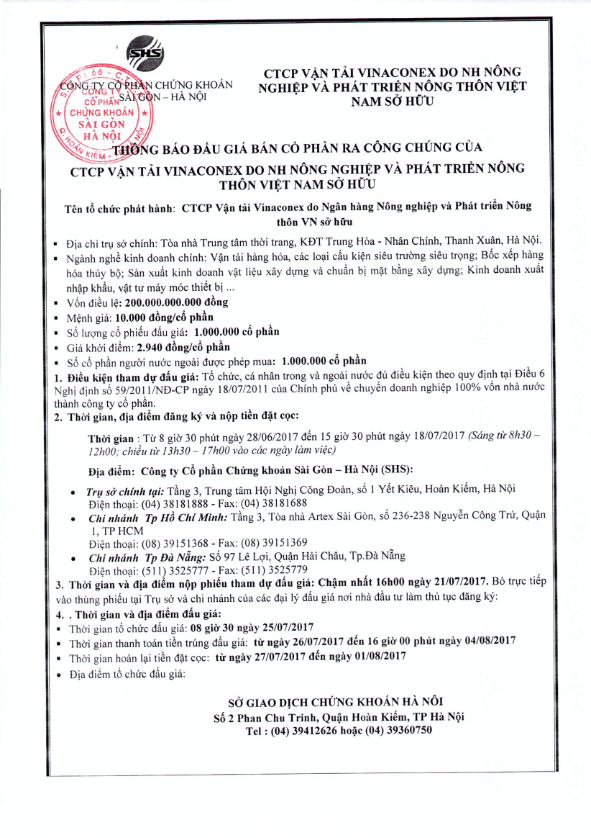 Thông báo đấu giá CTCP Vận tải Vinaconex do Ngân hàng Nông nghiệp và Phát triển Nông thôn VN sở hữu