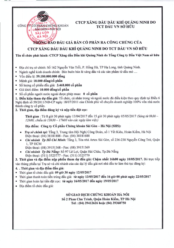 Thông báo đấu giá CTCP Xăng dầu Dầu khí Quảng Ninh do Tổng Công ty Dầu Việt Nam sở hữu