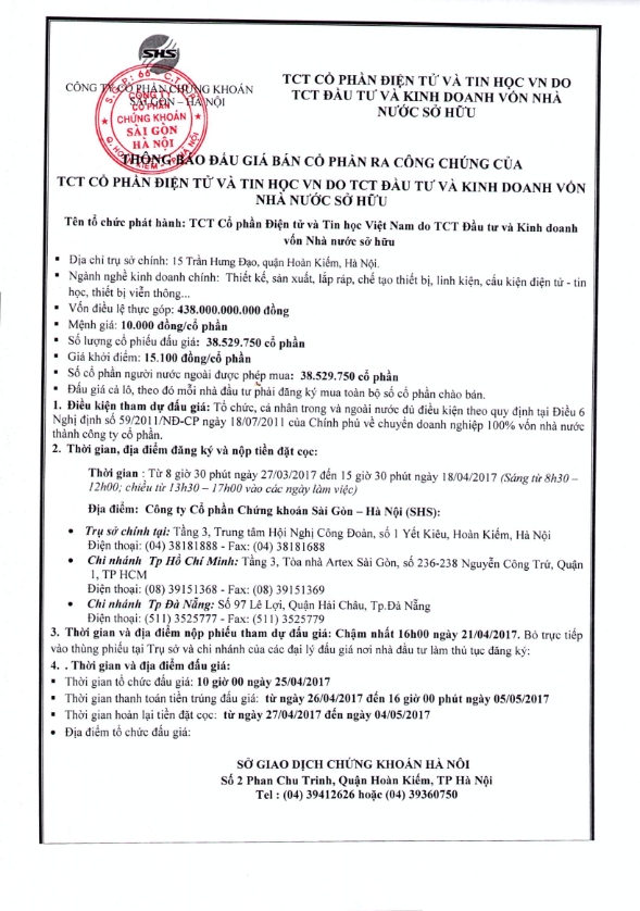 Thông báo đấu giá Tổng CTCP Điện tử và Tin học Việt Nam do TCT Đầu tư và kinh doanh vốn Nhà nước sở hữu