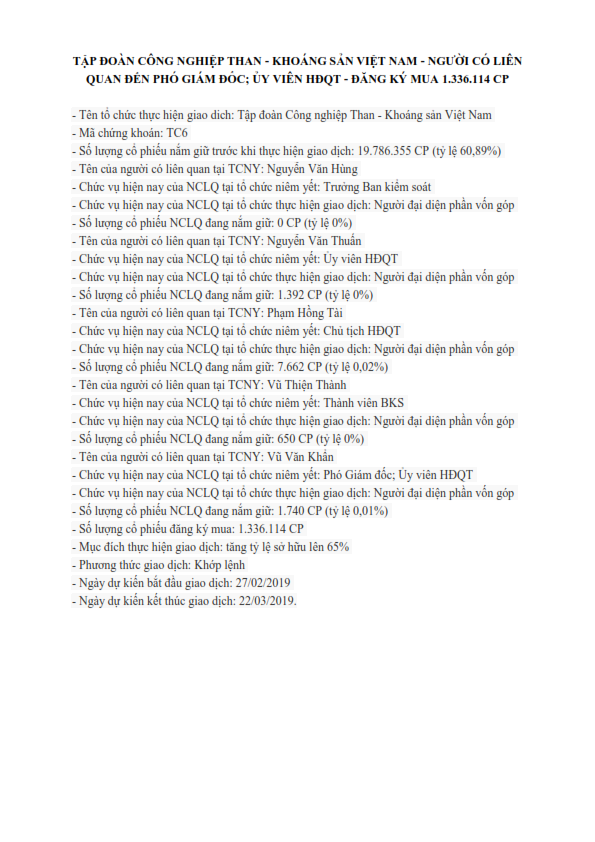 Thông báo giao dịch cổ phiếu CTCP Than Cọc Sáu – Vinacomin của Tập đoàn Công nghiệp Than – Khoáng sản Việt Nam