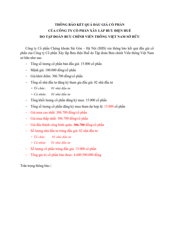 Thông báo Kết quả bán đấu giá cổ phần CTCP Xây lắp Bưu điện Huế thuộc sở hữu của Tập đoàn Bưu chính Viễn thông Việt Nam