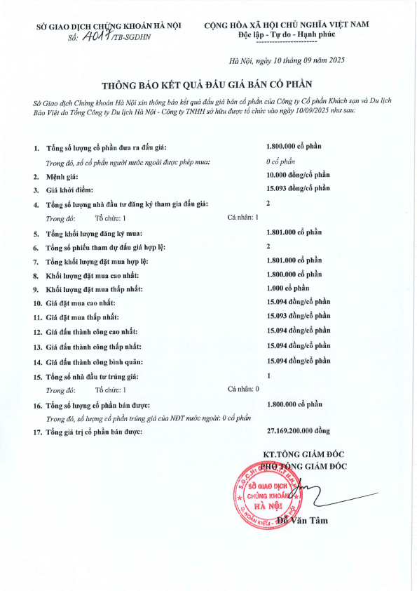 Thông báo kết quả bán đấu giá cổ phần của Tổng Công ty Du lịch Hà Nội tại Công ty Cổ phần Khách sạn và Du lịch Bảo Việt