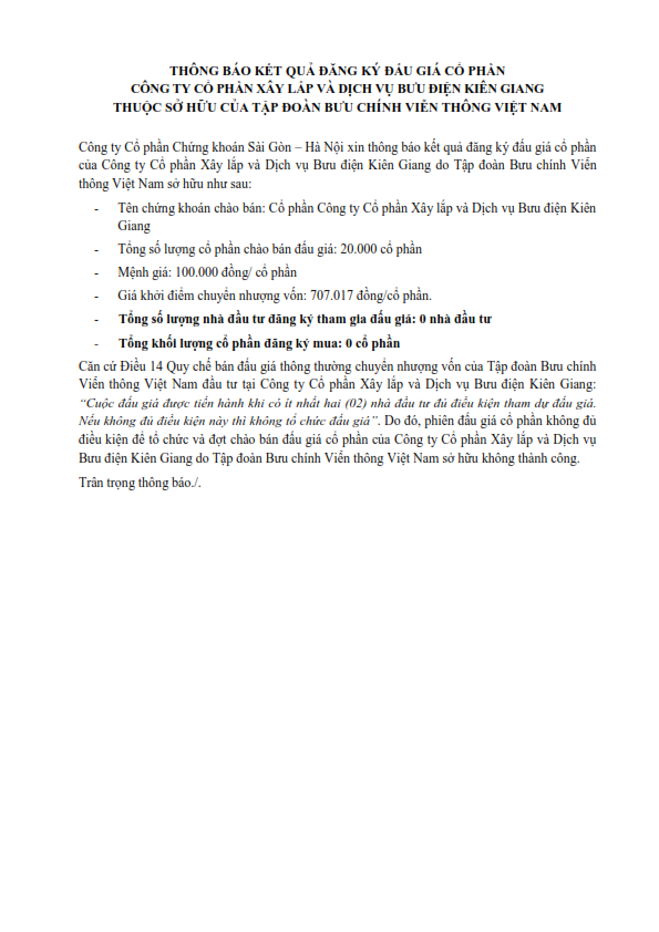 Thông báo kết quả đăng ký đấu giá cổ phần CTCP Xây lắp và Dịch vụ Bưu điện Kiên Giang thuộc sở hữu của Tập đoàn Bưu chính Viễn thông Việt Nam