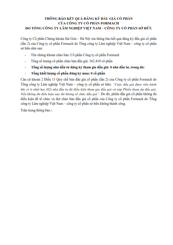 Thông báo kết quả đăng ký đấu giá cổ phần của CTCP Formach do TCT Lâm nghiệp Việt Nam - CTCP sở hữu