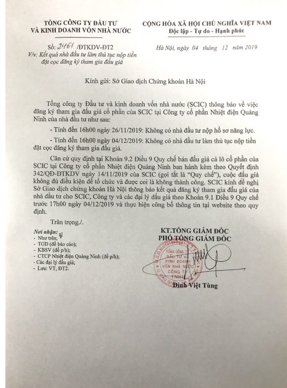 Thông báo kết quả đăng ký đấu giá cổ phần Tổng công ty Đầu tư và Kinh doanh vốn nhà nước tại Công ty cổ phần Nhiệt điện Quảng Ninh