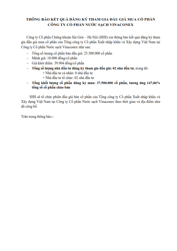 Thông báo kết quả đăng ký đấu giá Công ty Cổ phần Nước sạch Vinaconex