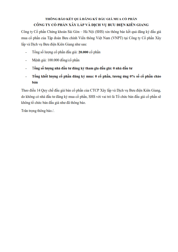THÔNG BÁO KẾT QUẢ ĐĂNG KÝ ĐẤU GIÁ MUA CỔ PHẦN CÔNG TY CỔ PHẦN XÂY LẮP VÀ DỊCH VỤ BƯU ĐIỆN KIÊN GIANG