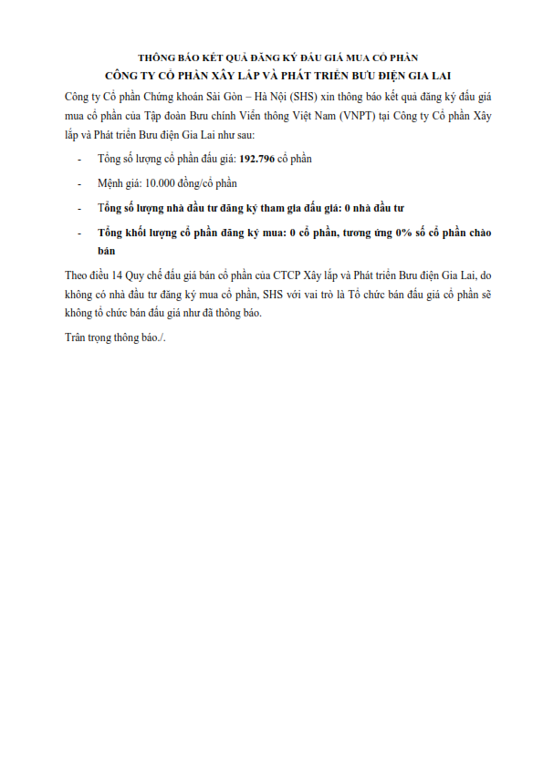 Thông báo kết quả đăng ký đấu giá mua cổ phần CTCP Xây lắp và phát triển bưu điện Gia Lai