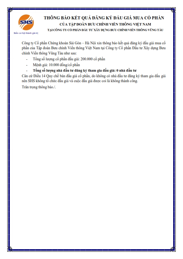 THÔNG BÁO KẾT QUẢ ĐĂNG KÝ ĐẤU GIÁ MUA CỔ PHẦN CỦA TẬP ĐOÀN BƯU CHÍNH VIỄN THÔNG VIỆT NAM TẠI CÔNG TY CỔ PHẦN ĐẦU TƯ XÂY DỰNG BƯU CHÍNH VIỄN THÔNG VŨNG TÀU