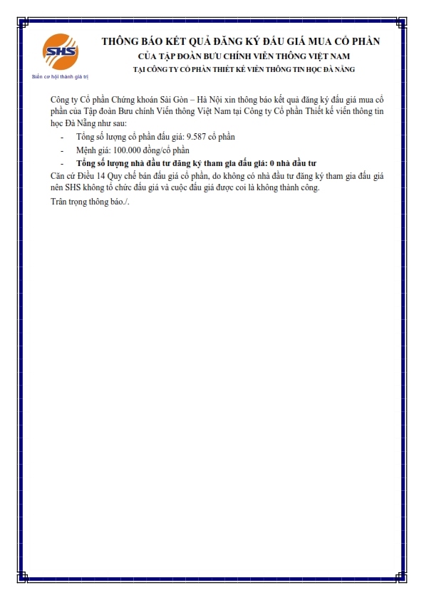 THÔNG BÁO KẾT QUẢ ĐĂNG KÝ ĐẤU GIÁ MUA CỔ PHẦN CỦA TẬP ĐOÀN BƯU CHÍNH VIỄN THÔNG VIỆT NAM TẠI CÔNG TY CỔ PHẦN THIẾT KẾ VIỄN THÔNG TIN HỌC ĐÀ NẴNG