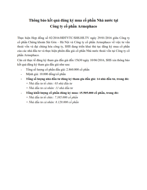 - Thông báo kết quả đấu giá cổ phần Nhà nước tại Công ty cổ phần Armephaco - 15/06/2016