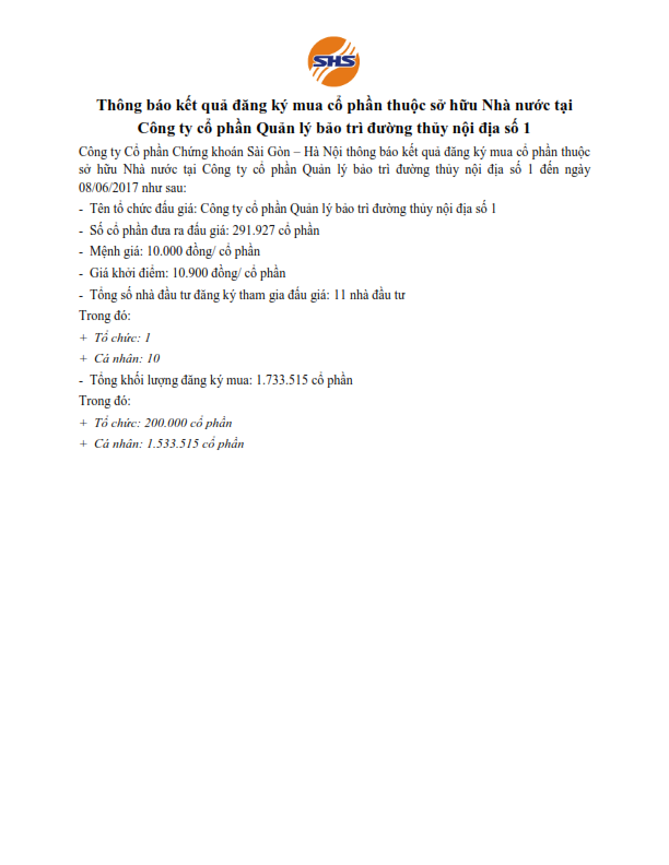 - Thông báo kết quả đấu giá cổ phần thuộc sở hữu Nhà nước tại Công ty cổ phần Quản lý bảo trì đường thủy nội địa số 1 - 14/06/2017