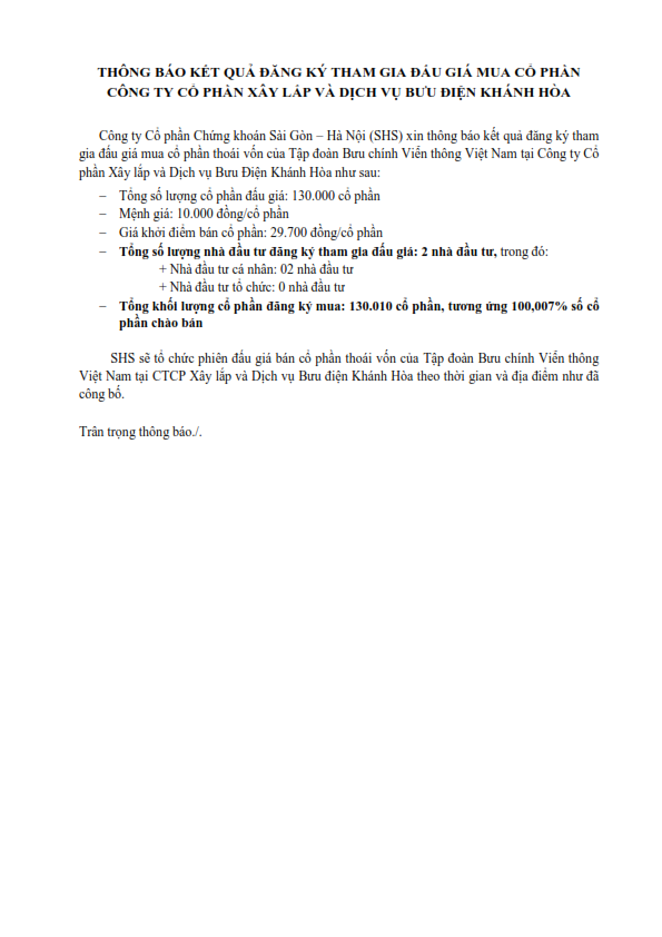 Thông báo kết quả đăng ký tham gia đấu giá mua cổ phần thoái vốn của Tập đoàn Bưu chính Viễn thông Việt Nam tại Công ty Cổ phần Xây lắp và Dịch vụ Bưu Điện Khánh Hòa