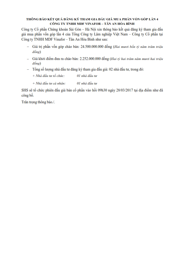 Thông báo kết quả đăng ký tham gia đấu giá mua phần góp vốn lần 4 Công ty TNHH MDF Vinafor - Tân An Hòa Bình