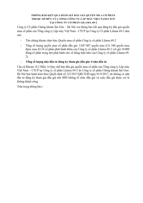Thông báo kết quả đăng ký tham gia đấu giá quyền mua cổ phần thuộc sở hữu của Tổng công ty Lắp máy Việt Nam – CTCP tại Công ty cổ phần Lilama 69-2