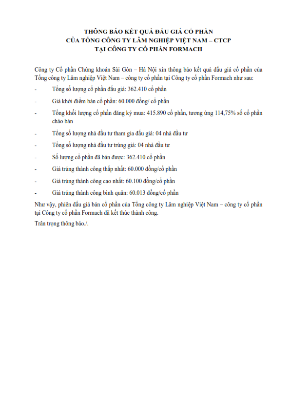 Thông báo kết quả đấu giá cổ phần của TCT Lâm nghiệp Việt Nam - CTCP tại CTCP Formach