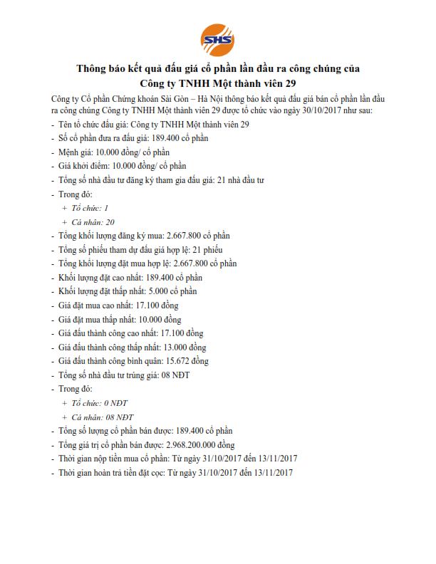 Thông báo kết quả đấu giá cổ phần lần đầu ra công chúng của Công ty TNHH Một thành viên 29