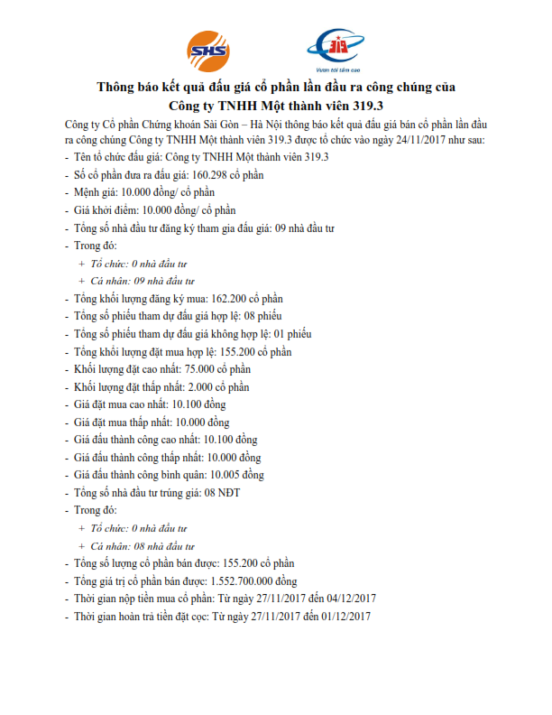 Thông báo kết quả đấu giá cổ phần lần đầu ra công chúng của Công ty TNHH MTV 319.3