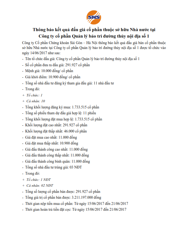 - Thông báo kết quả đăng ký mua cổ phần thuộc sở hữu Nhà nước tại Công ty cổ phần Quản lý bảo trì đường thủy nội địa số 1 - 08/06/2017
