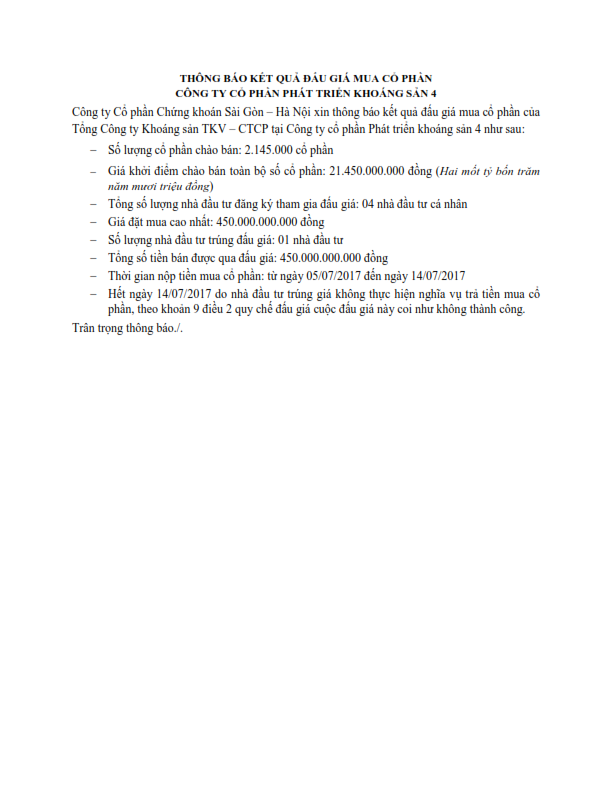Thông báo kết quả đấu giá mua cổ phần Công ty cổ phần Phát triển khoáng sản 4