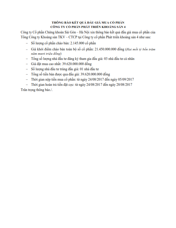 Thông báo kết quả đấu giá mua cổ phần của Tổng Công ty Khoáng sản TKV – CTCP tại Công ty cổ phần Phát triển khoáng sản 4