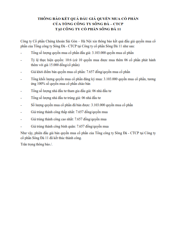 Thông báo kết quả đấu giá quyền mua cổ phần của Tổng công ty Sông Đà - CTCP tại Công ty cổ phần Sông Đà 11