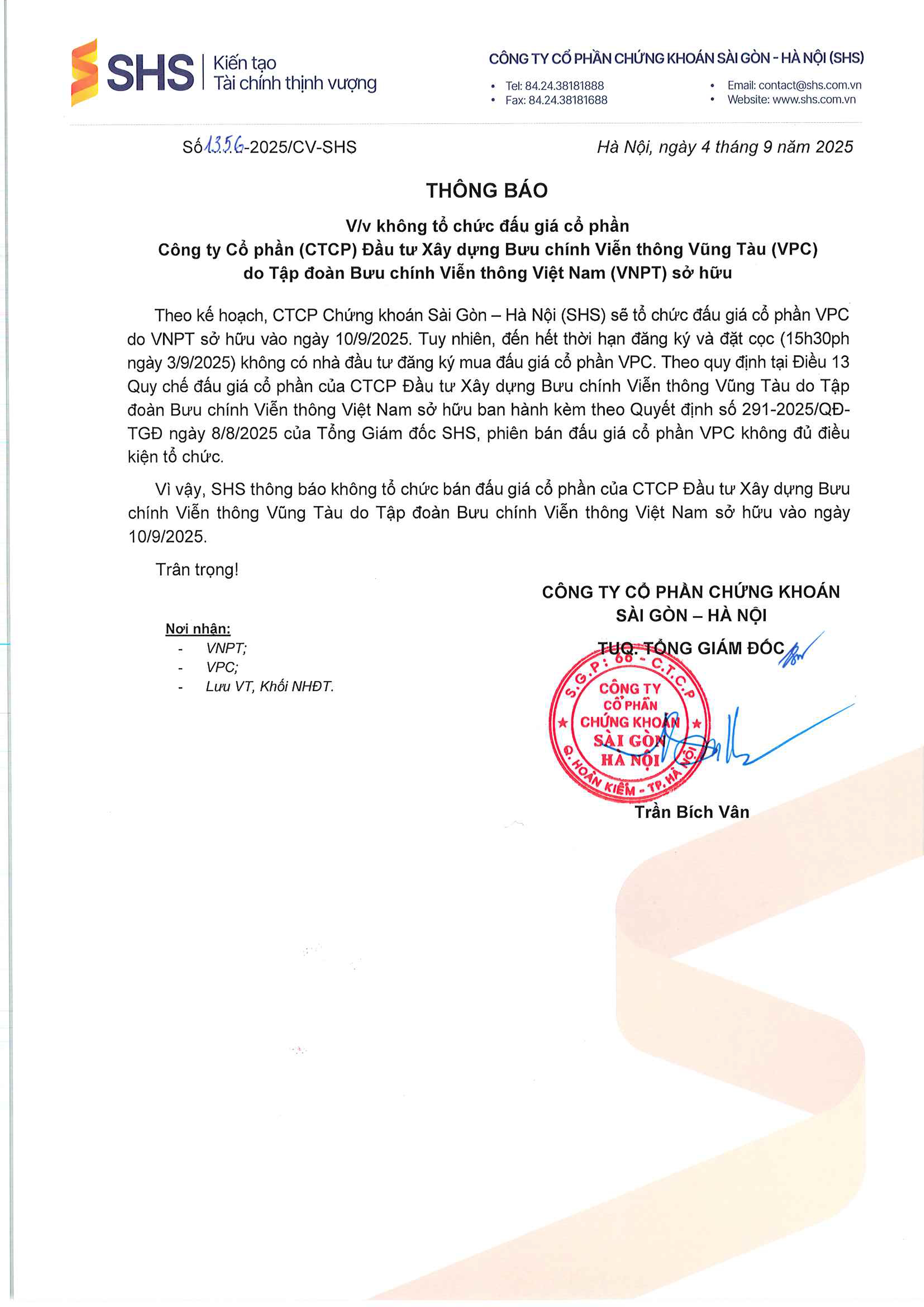 Thông báo không tổ chức đấu giá cổ phần CTCP Đầu tư Xây dựng Bưu chính Viễn thông Vũng Tàu (VPC) do VNPT sở hữu