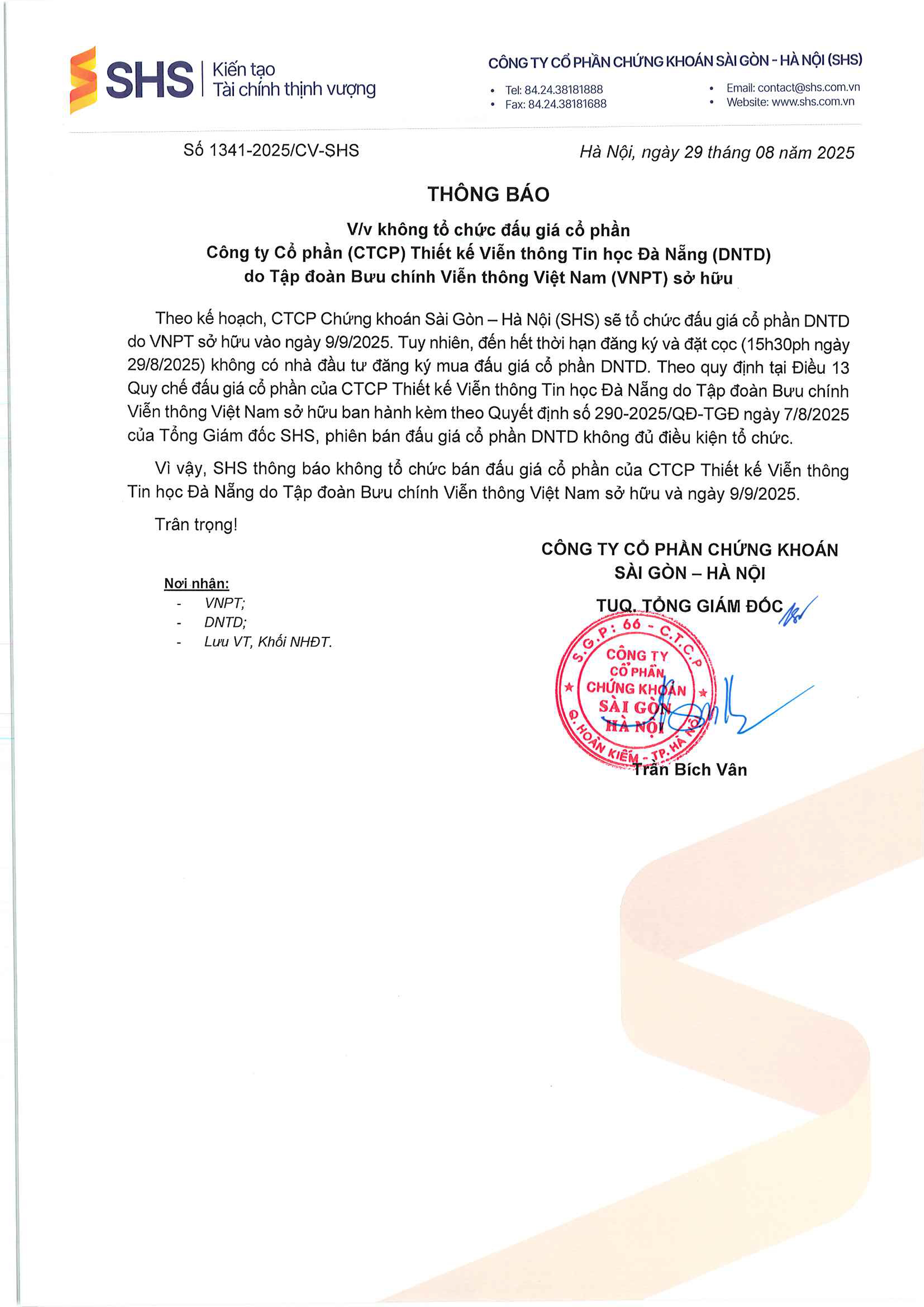 Thông báo không tổ chức đấu giá cổ phần CTCP Thiết kế Viễn thông Tin học Đà Nẵng (DNTD) do VNPT sở hữu