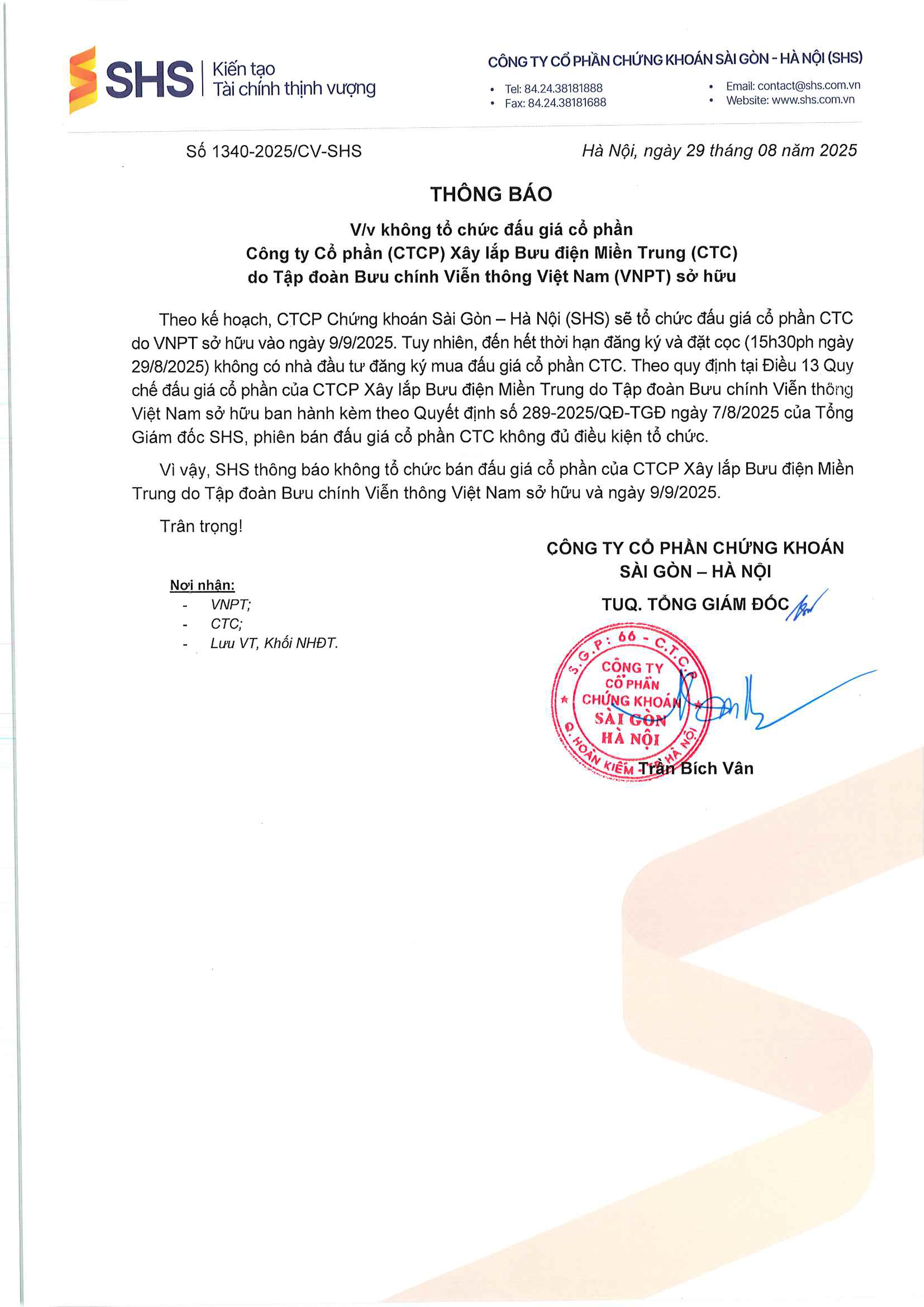 Thông báo không tổ chức đấu giá cổ phần CTCP Xây lắp Bưu điện Miền Trung (CTC) do VNPT sở hữu