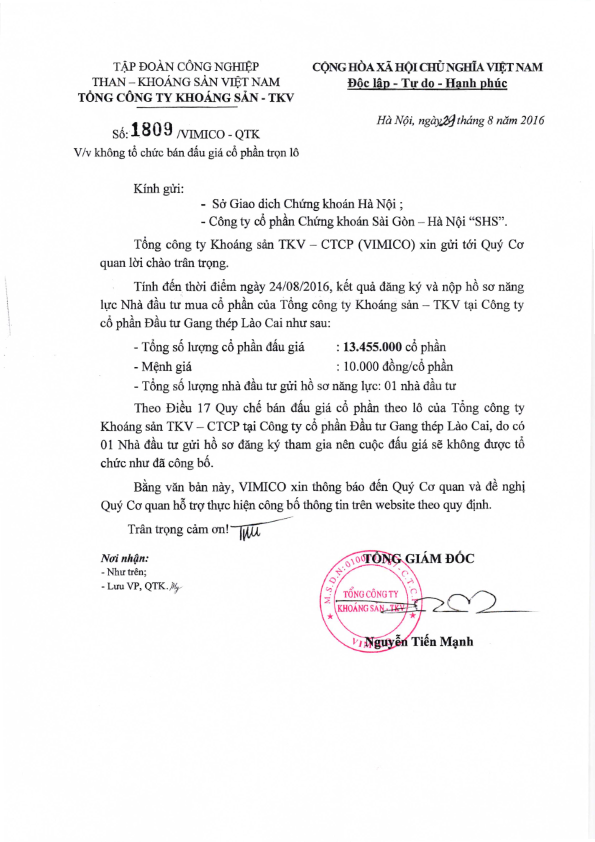 Thông báo không tổ chức đấu giá lô cổ phần của Tổng công ty Khoáng sản TKV – CTCP tại CTCP Đầu tư Gang thép Lào Cai – Vimico