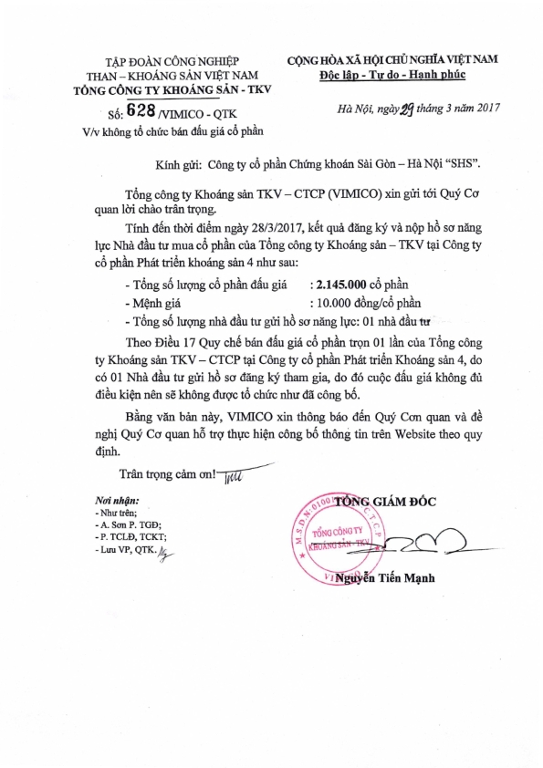Thông báo không tổ chức phiên đấu giá mua cổ phần của Vimico tại CTCP Phát triển khoáng sản 4