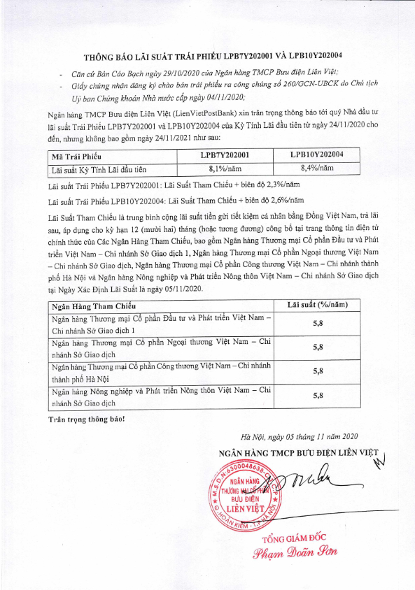 - LPB: Thông báo chào bán trái phiếu ra công chúng Ngân hàng Bưu điện Liên Việt năm 2020 - 05/11/2020