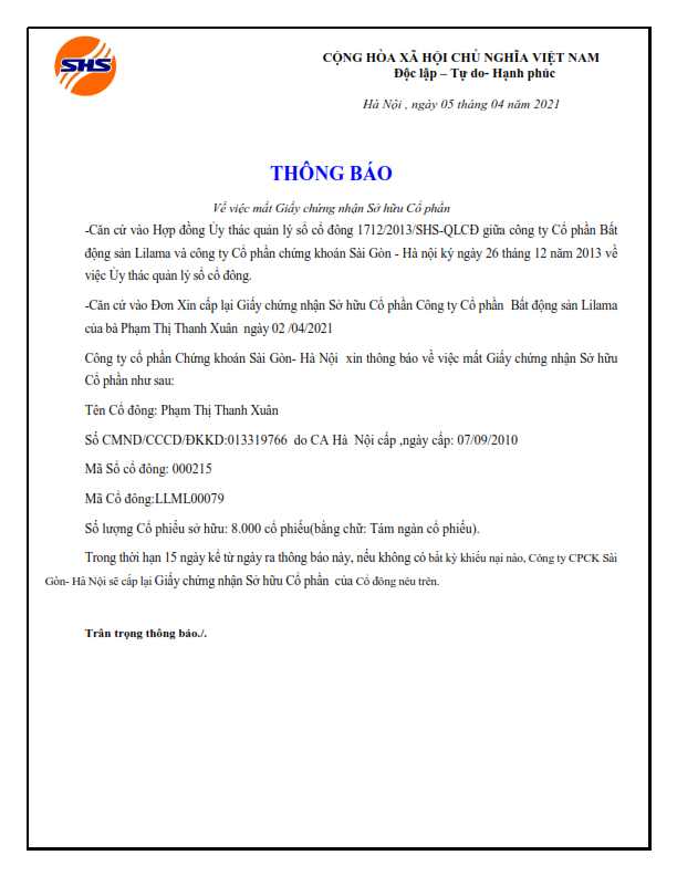 Thông báo mất Giấy Chứng nhận Sở Hữu Trái Phiếu Công ty CP Lilamaland