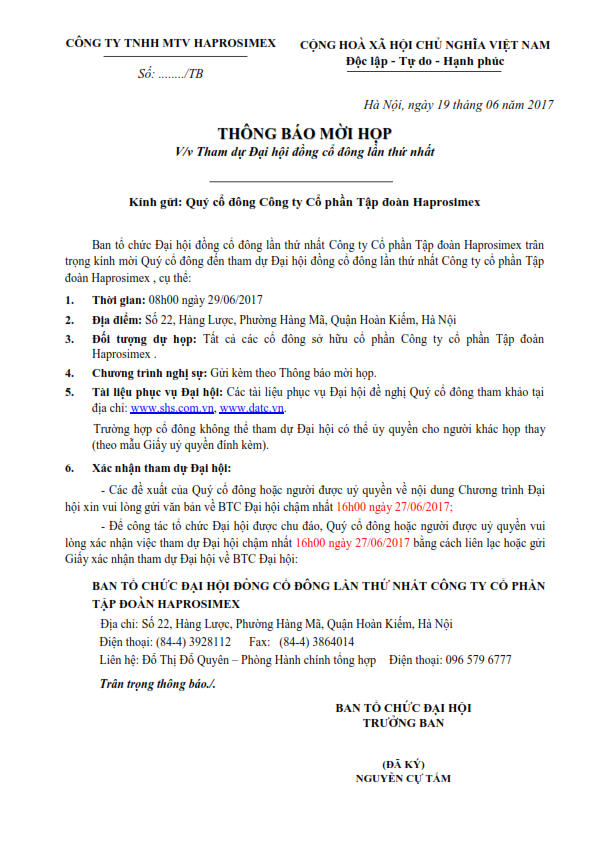 Thông báo mời họp Đại hội đồng cổ đông lần thứ nhất Công ty Cổ phần Tập đoàn Haprosimex