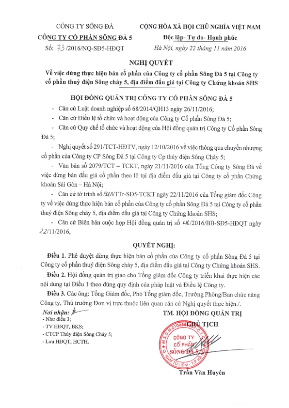 Thông báo: Nghị quyết về việc dừng thực hiện bán cổ phần của CTCP Sông Đà 5 tại CTCP thủy điện Sông Chảy 5, địa điểm đấu giá tại CTCP Chứng khoán SHS