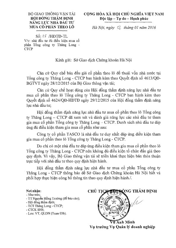 Thông báo Nhà đầu tư đủ điều kiện mua Cổ phần của Tổng công ty Thăng Long - CTCP
