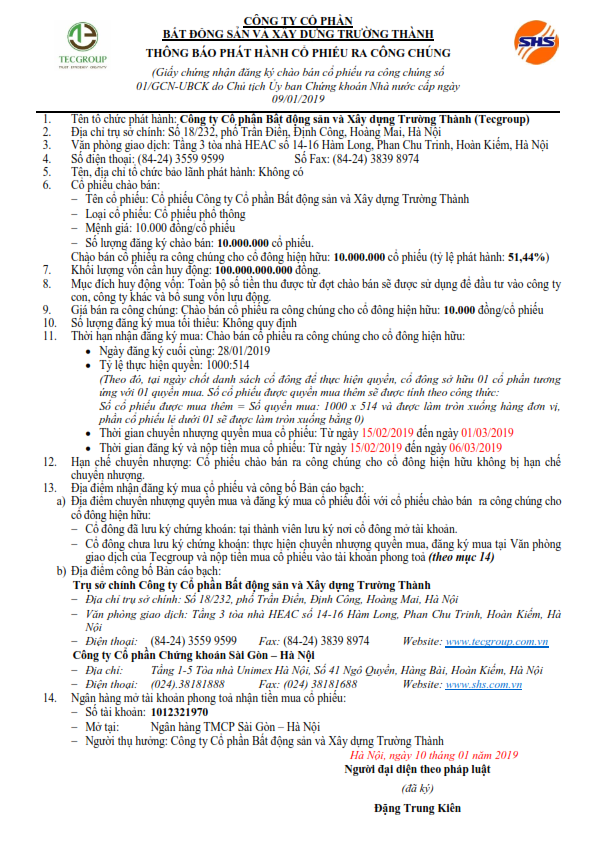 Thông báo phát hành cổ phiếu ra công chúng CTCP Bất động sản và Xây dựng Trường Thành