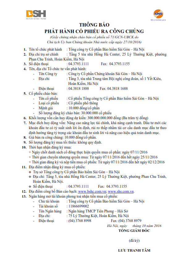 Thông báo phát hành cổ phiếu ra công chúng của Tổng Công ty cổ phần Bảo hiểm Sài Gòn - Hà Nội (BSH)