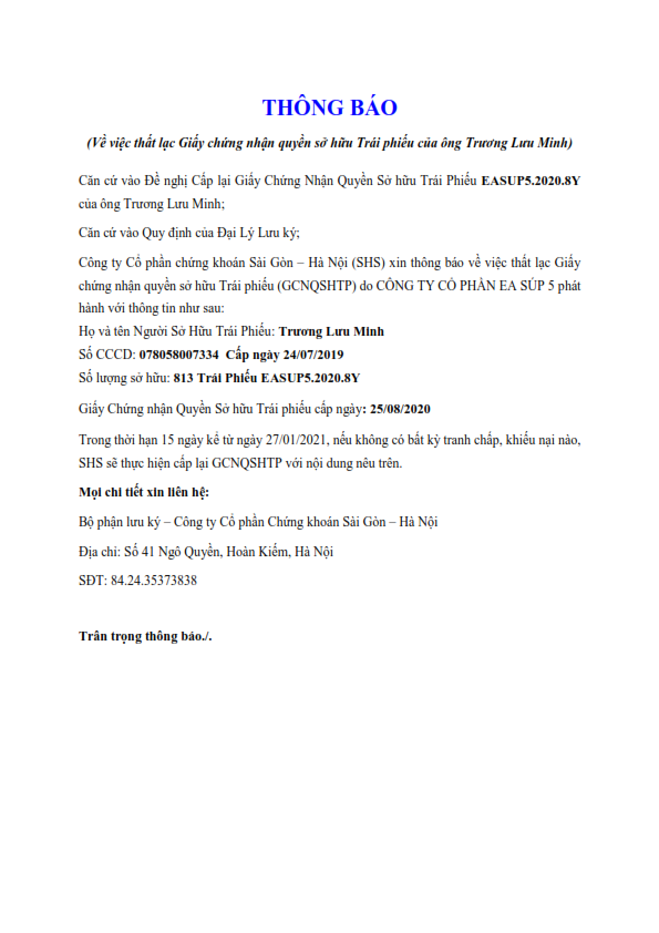 Thông báo Thất lạc Giấy Chứng nhận Quyền Sở hữu Trái Phiếu Easup5.2020.8Y của ông Trương Lưu Minh