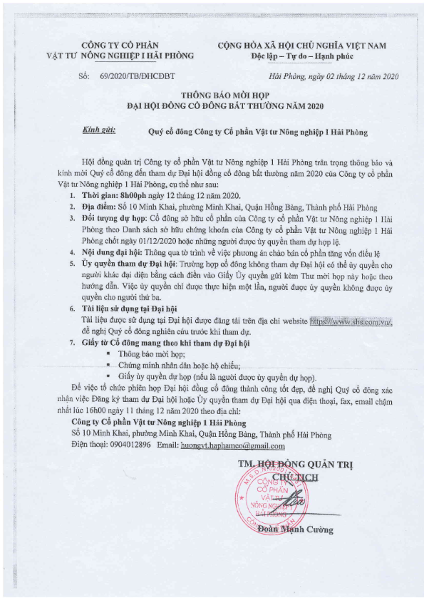 Thông báo tổ chức Đại hội đồng cổ đông bất thường năm 2020 của CTCP Vật tư Nông nghiệp I Hải Phòng