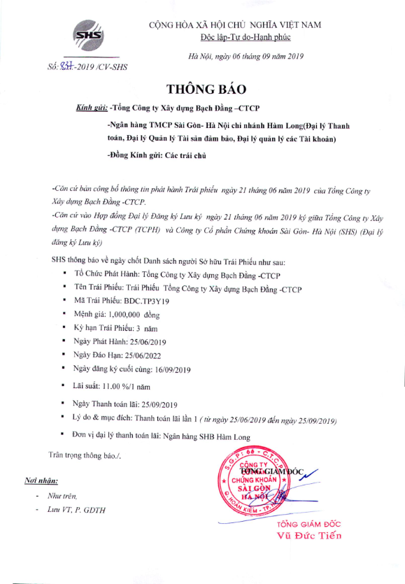Thông báo về ngày chốt Danh sách NSH Trái Phiếu Tổng Công ty Xây dựng Bạch Đằng -CTCP