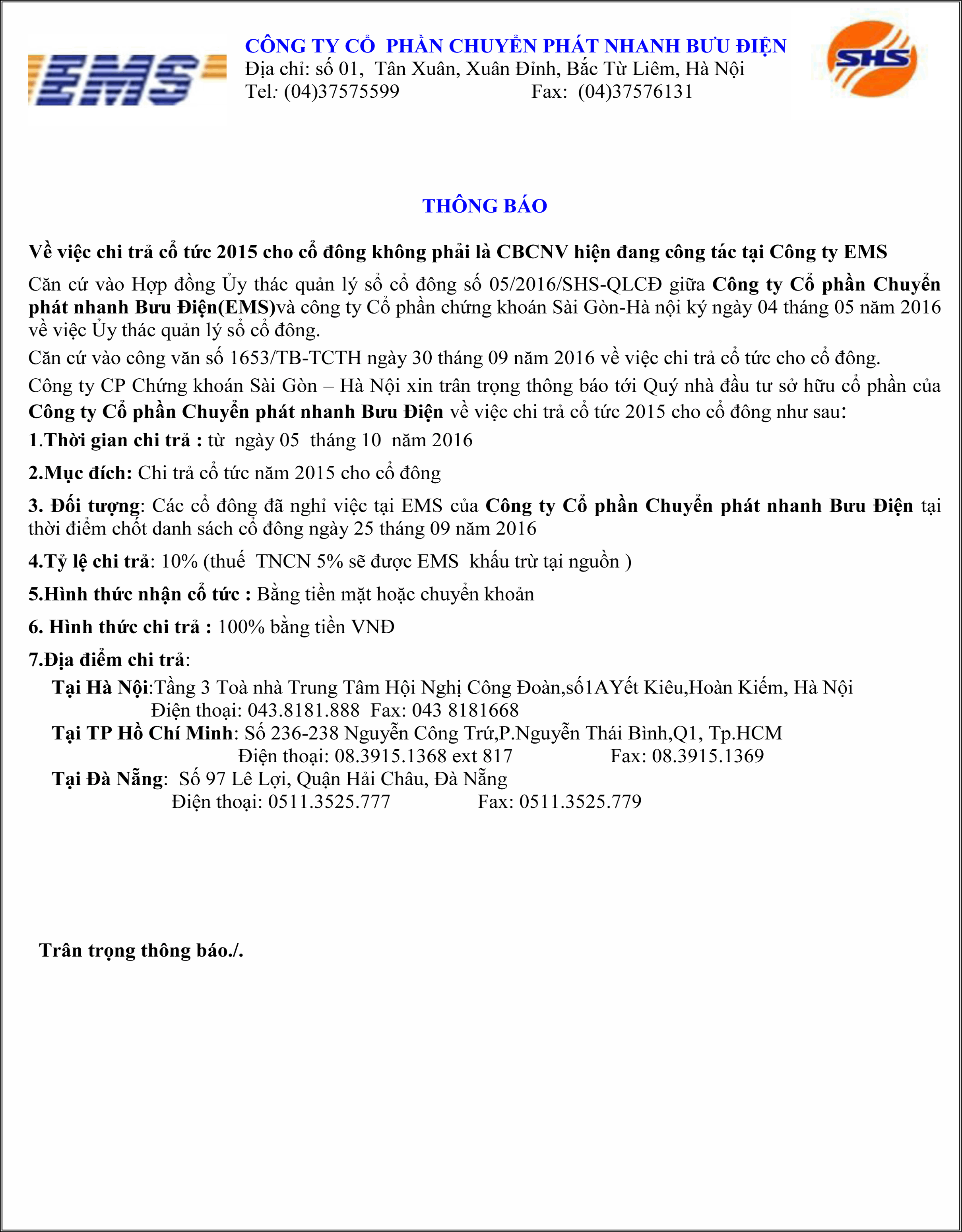 Thông báo về việc chi trả cổ tức 2015 cho cổ đông không phải là CBCNV hiện đang công tác tại Công ty EMS
