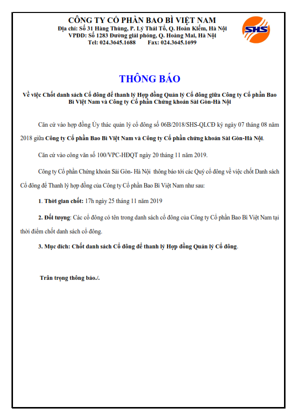 Thông báo Về việc Chốt danh sách Cổ đông để thanh lý Hợp đồng Quản lý Cổ đông của CTCP Bao bì Việt Nam