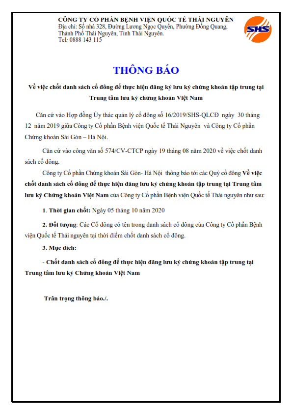 Thông báo Về việc chốt danh sách cổ đông để thực hiện đăng ký lưu ký chứng khoán tập trung tại Trung tâm lưu ký chứng khoán Việt Nam của Công ty Cổ phần Bệnh viện quốc tế Thái Nguyên