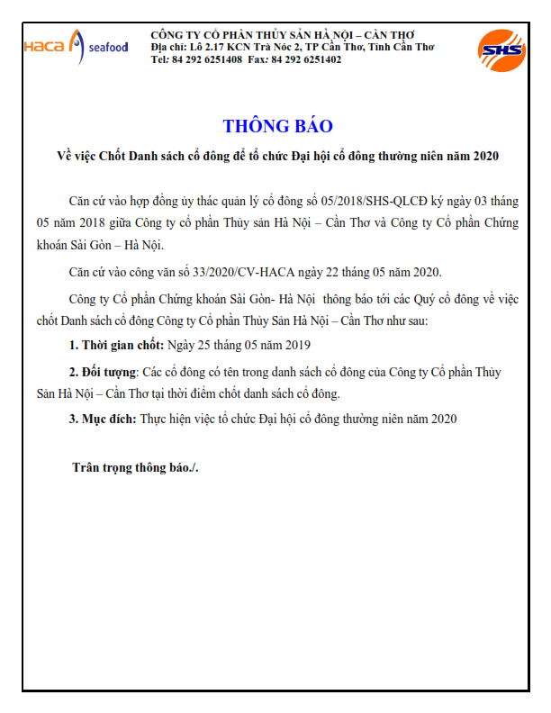 Thông báo Về việc Chốt danh sách Cổ đông để tổ chức ĐHĐCĐ thường niên năm 2020 của CTCP Thủy sản Hà Nội-Cần Thơ