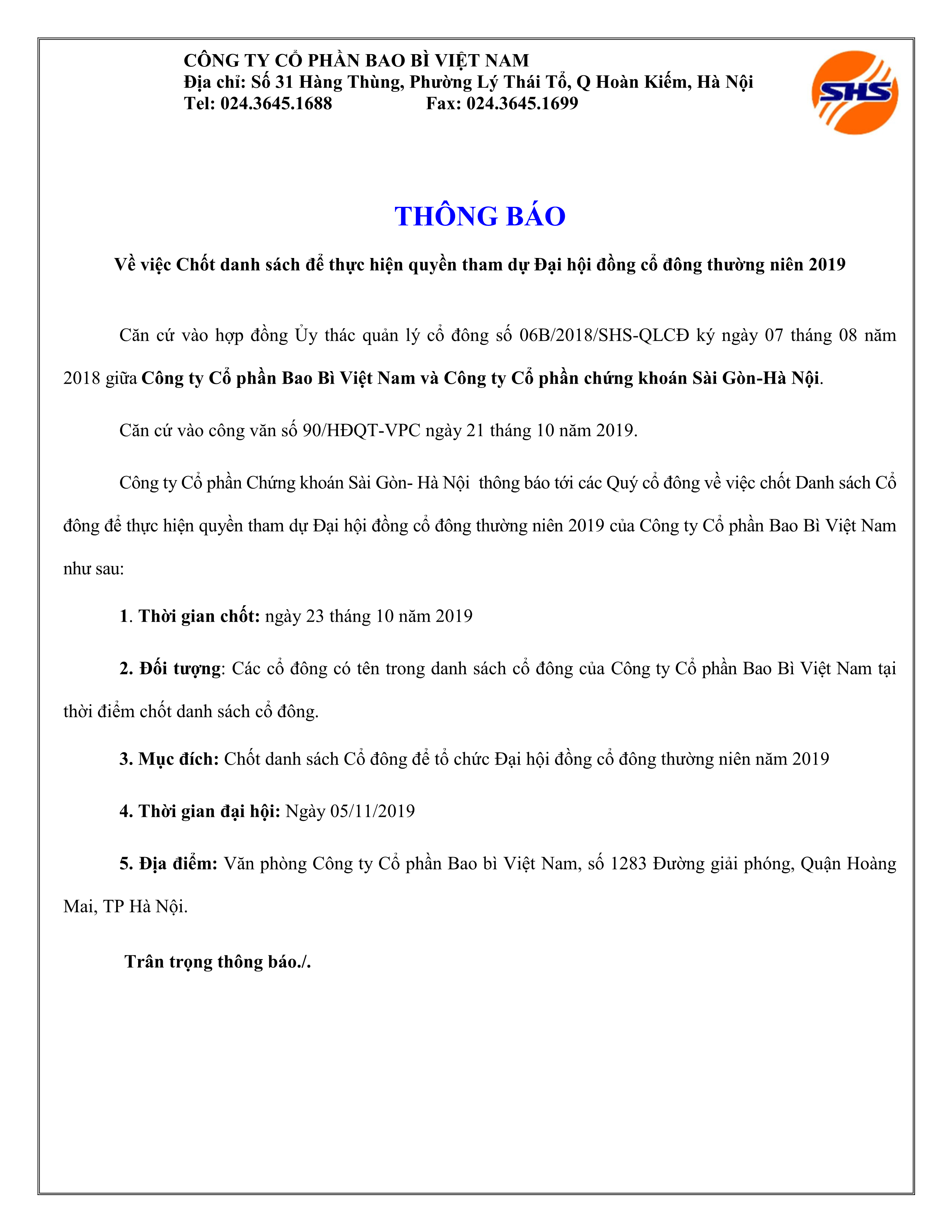 Thông báo về việc chốt danh sách để thực hiện quyền tham dự Đại hội đồng cổ đông thường niên năm 2019 của Công ty cổ phần bao bì Việt Nam
