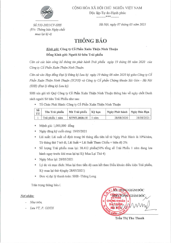 - Thông báo Về việc chốt danh sách Người sở hữu Trái phiếu để thực hiện Trả lãi kỳ 4 cho CTCP Xuân Thiện Ninh Thuận - 06/05/2021