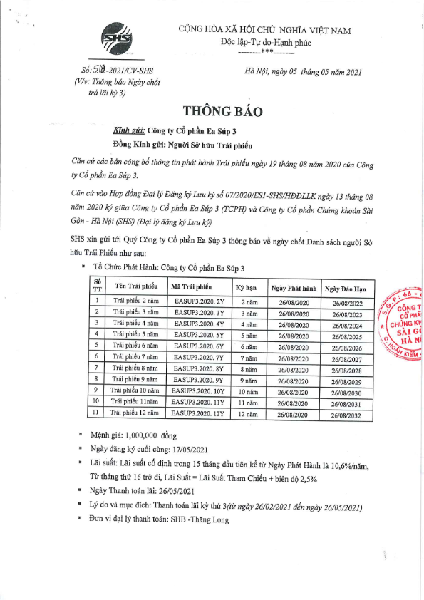 Thông báo Về việc chốt danh sách Người sở hữu Trái phiếu để thực hiện Trả lãi kỳ 3 cho CTCP Ea Súp 3