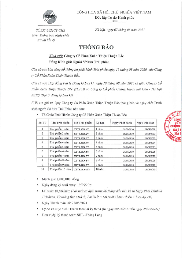 Thông báo Về việc chốt danh sách Người sở hữu Trái phiếu để thực hiện Trả lãi kỳ 4 cho CTCP Xuân Thiện Thuận Bắc